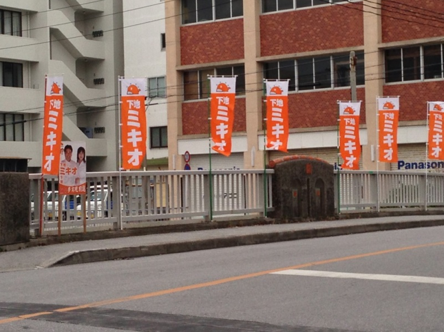 沖縄県の場合は大目に見られてるケースのようで、他の殆どの候補ののぼり旗が立っているのも見かけました。